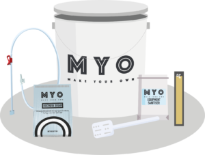 2. Clean and sanitise your Fermentation Bucket, lid and mixing paddle using MYO Equipment Sanitiser following the instructions on the packaging.